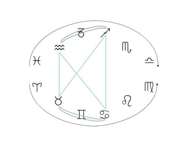 Die Stier-Venus muß ohne die Information für die Form der Erscheinung, welche sie zu bilden hat und die sie aus ihrem oberen Pendant Wassermann erwartet, zurechtkommen. Der Krebs-Mond bleibt ohne die Fügung des Lebens aus seinem oberen Pendant Schütze. Meine Deutung besagt, daß sich auf diese Weise die Empfindung von der Fügung nur wünschen kann, was in die Form kommen möge. Dies entspricht dem Charakter dieses Aspekts, der wie weiter oben ausgeführt u.a. für ein starkes Begehren von bestimmten Dingen steht. Ich nenne es „Sehnlichst Gewünschtes“ oder auch „Das Objekt der Begierde“, sei es aktiv oder passiv. Es ist dies die Sehnsucht nach Aphrodite, nach der Gestalt beinhaltenden und deshalb immer schönen Form der Erscheinung.